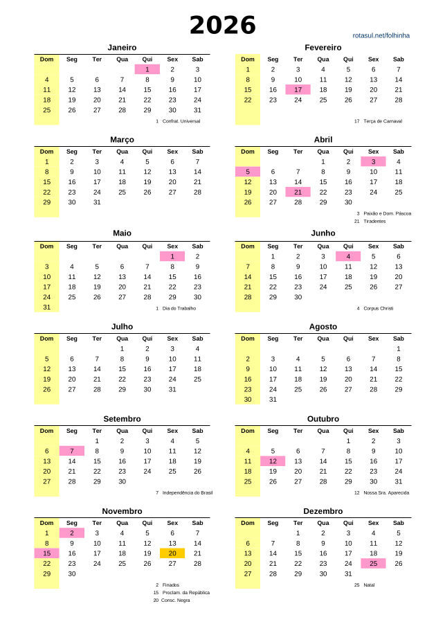 Calendários anuais com feriados, formato A4 em arquivos PDF.Hora GMT Brasília